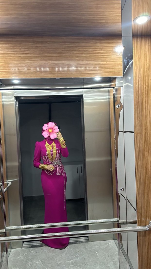 Uzun, drapeli ve etnik desenli pembe, notched lapel yakalı, uzun kollu, dar kesim kadın elbisesi. Düğün için uygundur.