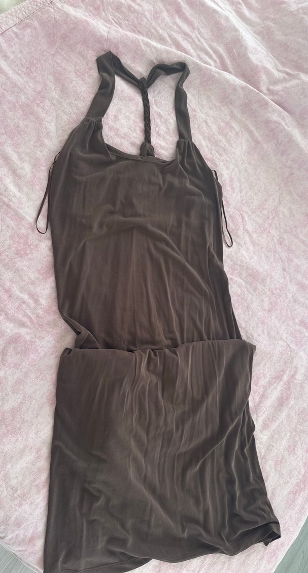 Bu koyu kahverengi uzun elbise, drapeli tasarım ve halter yakaya sahip, vücuda oturan kesimde. Kolsuz ve yumuşak sentetik kumaştan, romantik akşamlar için uygun, rahat gotik tarzda.
