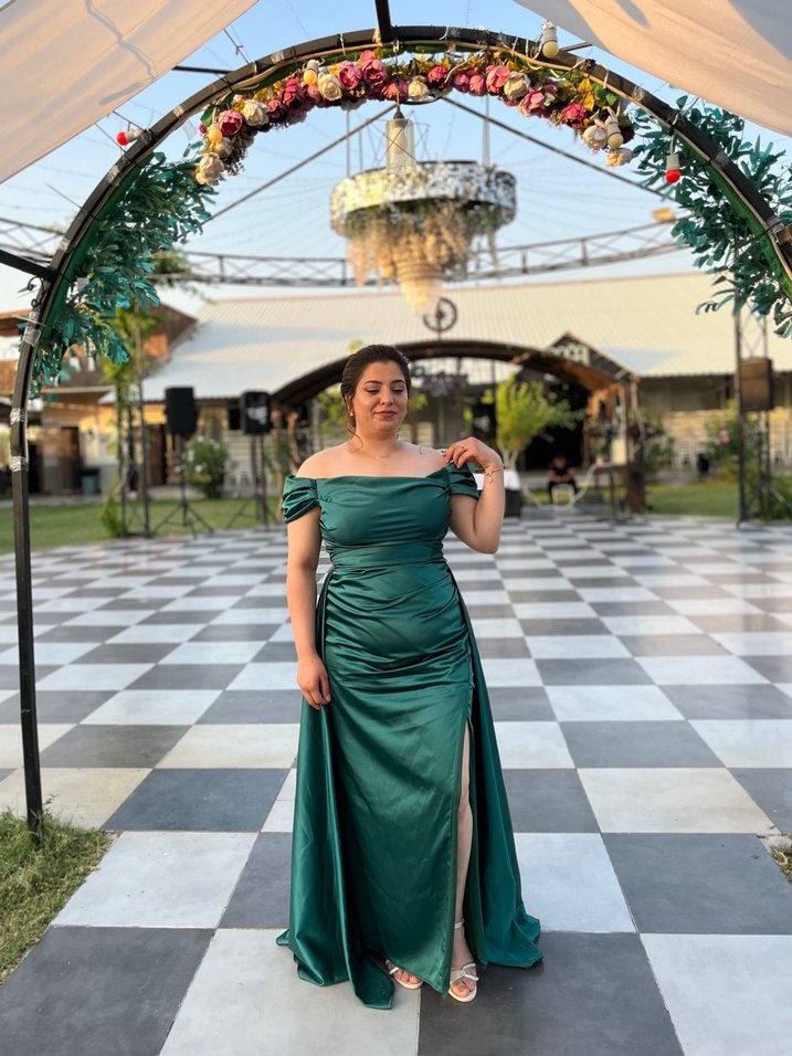 Bu haki renk uzun abiye elbise, drapeli tasarımı, kayık yaka ve ince askılarıyla klasik şıklık sunar. Parlak kumaşıyla düğünler için idealdir. 163 boy kg 80 deformesi yoktur 2 defa giyildi