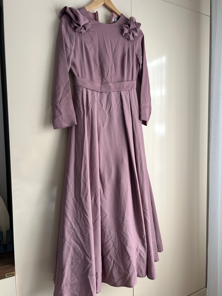 uzun elbise, yüksek yakalı ve regular fit kesime sahiptir. Yumuşak sentetik kumaştan, modern klasik tarzda, düğünler için uygundur. 36-38 beden uyumlu