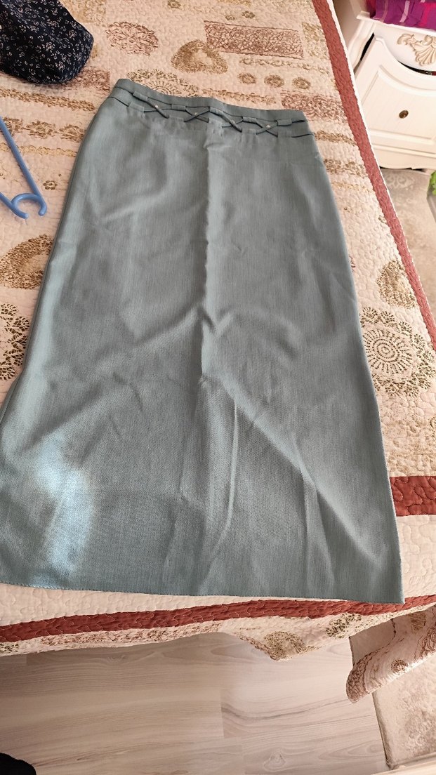 turkuaz renkte, sentetik kumaştan üretilmiş, drapeli ve regular fit uzun etek. Minimalist ve sade tarzlara uygun, ofis kullanımı için ideal.