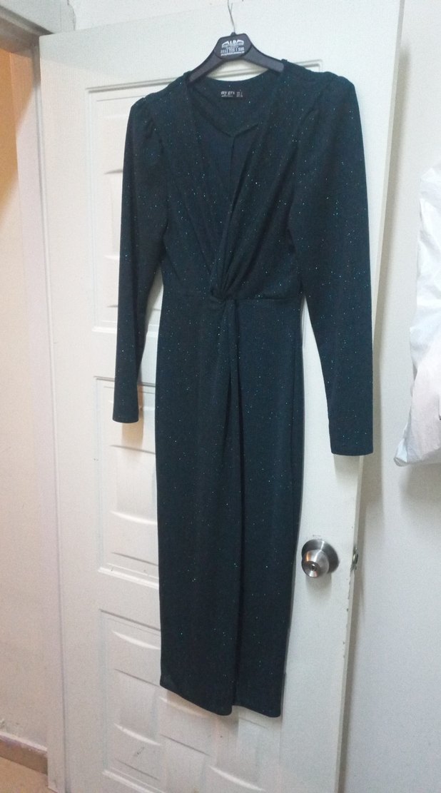 Drapeli detaylı, uzun ve dar kesim elbise. Notlu yaka ve uzun kollu, koyu yeşil renkte, sentetik kumaştan klasik şıklık sunar. ✨