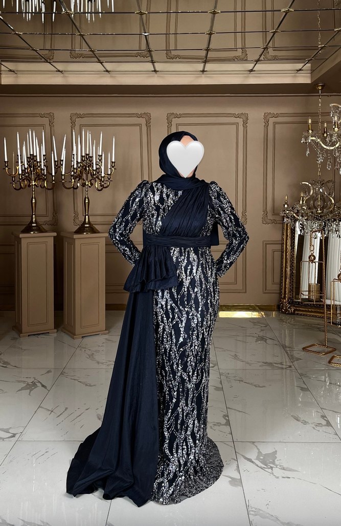 Drapeli tasarımı, kayık yaka ve uzun kolları olan uzun mavi abiye elbise. Desenli kumaş ve normal kesimle düğünlere uygundur. Sadece 1 kez giyildi hiçbir sorunu yoktur.