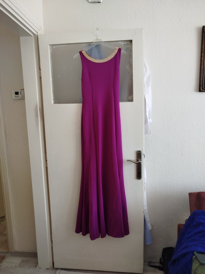 Uzun, drapeli mor abiye elbise, sıfır kol ve tekne yaka ile klasik ve minimal bir şıklık sunar. Düğünler için uygundur. ✨
