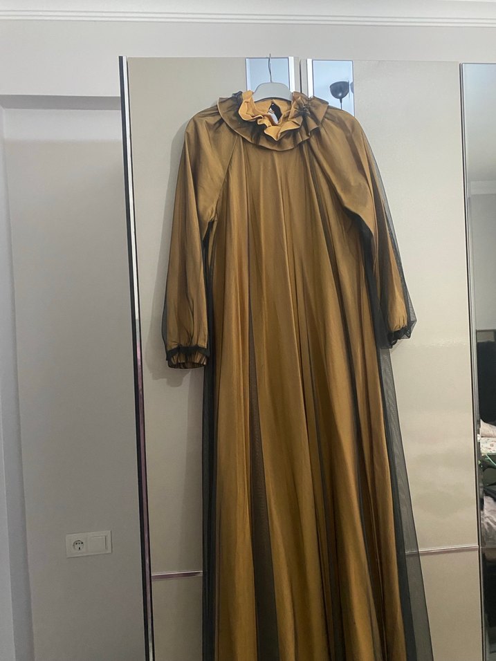 Yüksek yakalı, uzun kollu, drapeli ve bol kesim parlak kahverengi uzun kadın elbisesi. Vintage ve modern klasik tarzı bir arada sunar. ✨ ürün 38 beden ama daha büyük bedenlere de olur bol