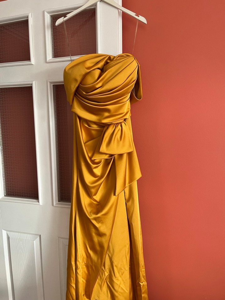 Bu uzun, straplez abiye elbise parlak altın renginde drapeli tasarıma sahiptir. Fitted kesimi ve kolsuz stiliyle düğünler ve avangart modayı sevenler için ideal. ✨ Hiç giyilmedi dolapta beklediği için etek kısımları kırışmış, sadece ütülenmesi gerekecektir.