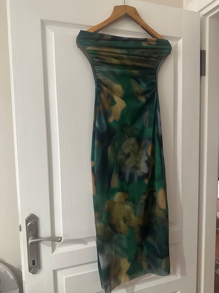 Drapeli, straplez uzun elbise, koyu çok renkli batik desenli. Sentetik kumaştan, avant-garde ve bohem tarzına uygun, romantik geceler için ideal.