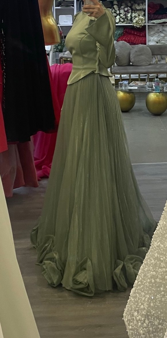 Uzun haki renkli, straplez yaka ve drapeli detaylara sahip kadın elbisesi. Çağdaş tarzda, kolsuz ve düğün için uygun. Avant-garde modaya uygun, zarif bir seçim.