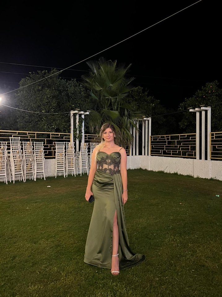 Bu straplez, drapeli ve vücuda oturan abiye elbise parlak haki kamuflaj deseniyle şık bir görünüm sunar. Kolsuz ve yırtmaçlı tasarımıyla göz alıcıdır.