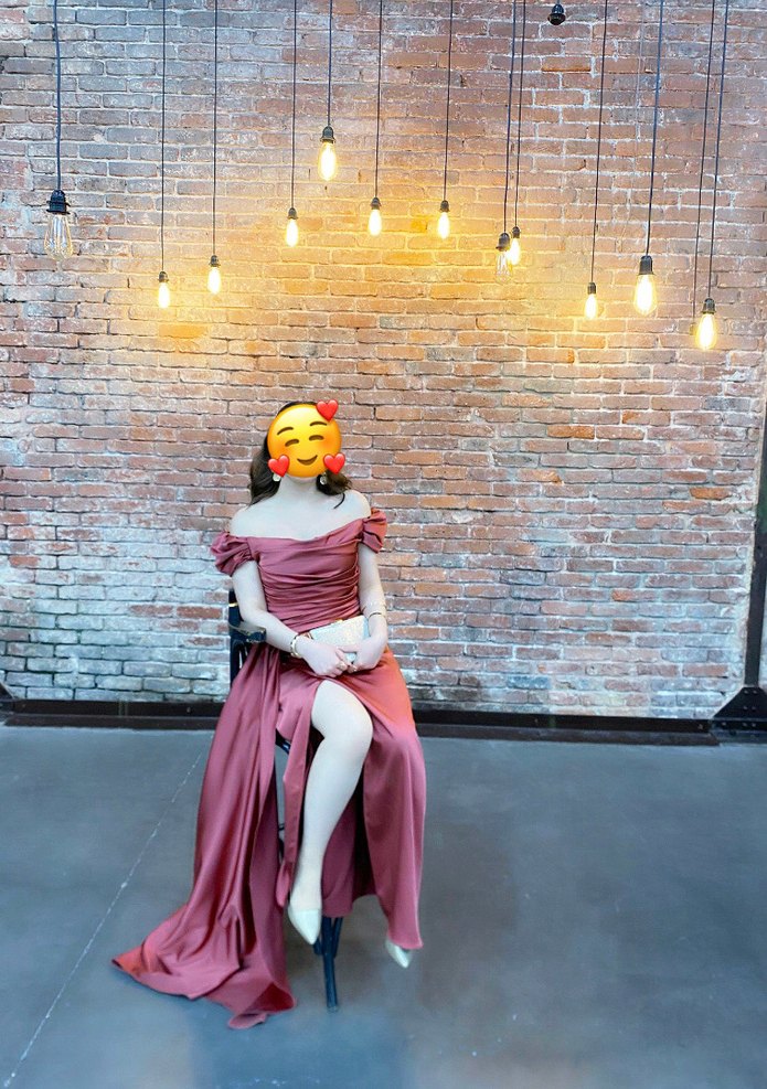 Bu dar kesim, uzun abiye elbise drapeli tasarımı, straplez yakası ve ince askılarıyla koyu pembe renktedir, parti için uygundur.