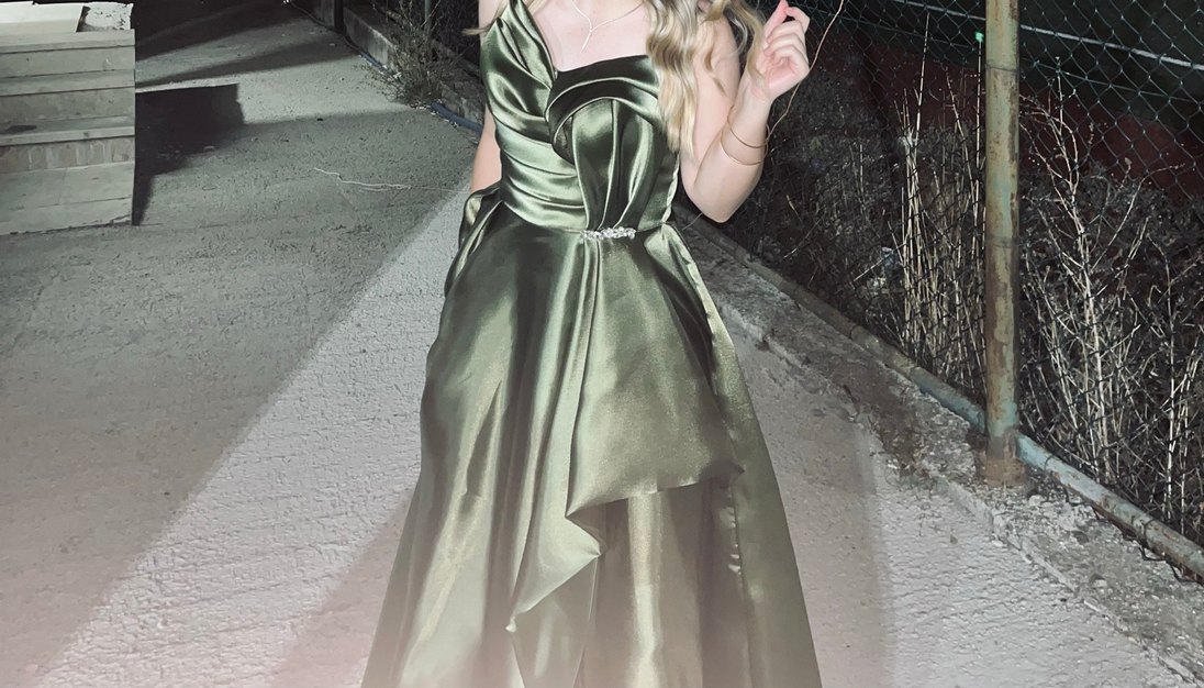 Bu uzun, straplez nişan elbisesi parlak haki kumaştan olup drapeli detaylara sahiptir.