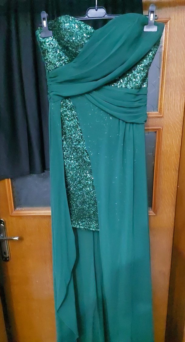 Fitted kesim, straplez uzun abiye elbise parlak turkuaz renkte, desenli payetli detaylar ve drapeli tasarıma sahiptir. Kolsuzdur, şık davetler için uygundur.