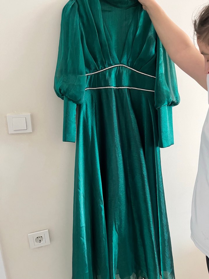 Uzun, drapeli ve v yaka tasarıma sahip, parlak yeşil renkte abiye elbise. İnce askılı ve vücuda oturan kesimiyle düğünler için uygun. Benim değildir takasa açık değil
