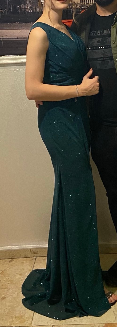 Fitted kesim, drapeli ve V yakalı uzun yeşil abiye elbise, kalın askılı kollara sahiptir, bir kez giyildi esnek yapıya sahip kendinden simli.