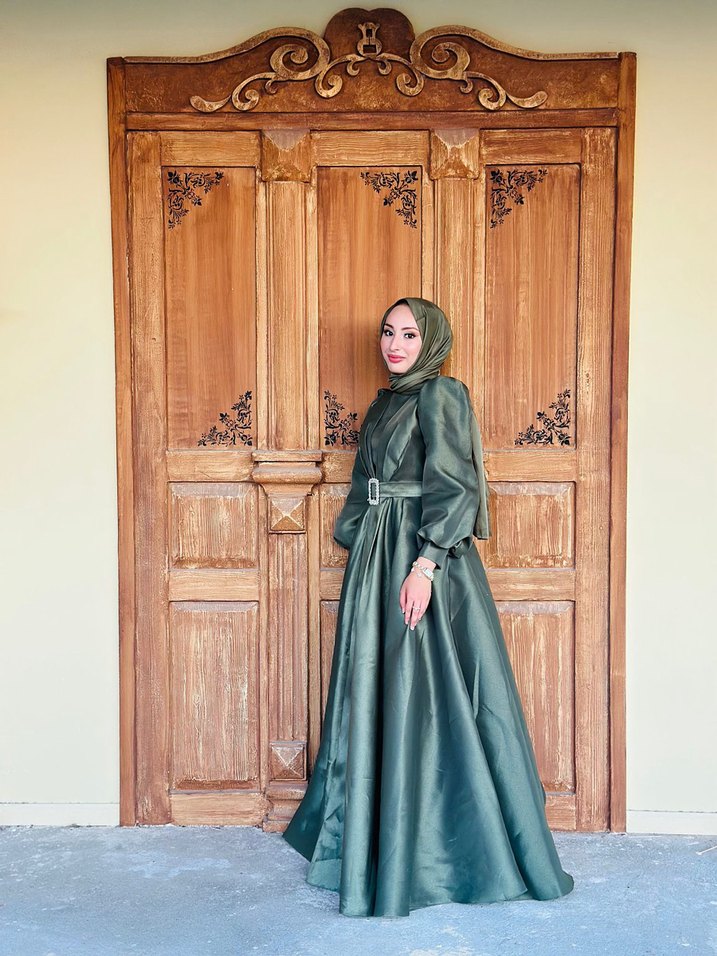 Parlak görünümlü, uzun, haki renkli abiye. Yüksek yakalı, drapeli ve askılı kollu, normal kesimdir. Düğünler için uygundur. ✨ şal dahildir
