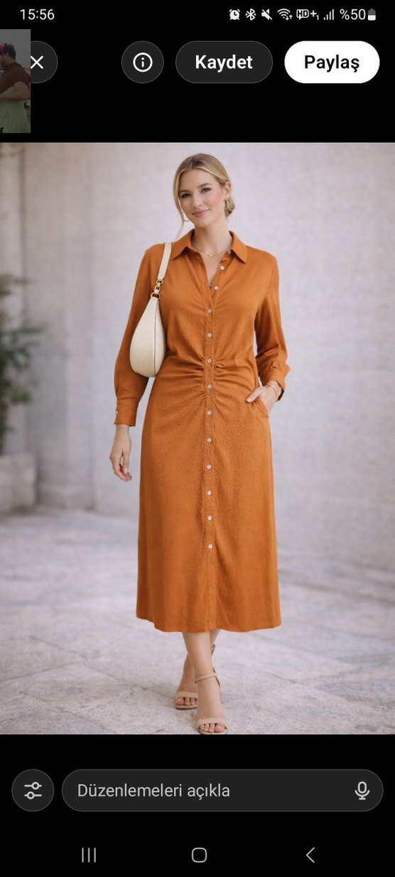 Bu uzun bej keten elbise, uzun kollu, tekne yakalı ve düğmeli ön tasarıma sahiptir. Rahat kesimi ve parlak dokusuyla günlük kullanıma uygundur.