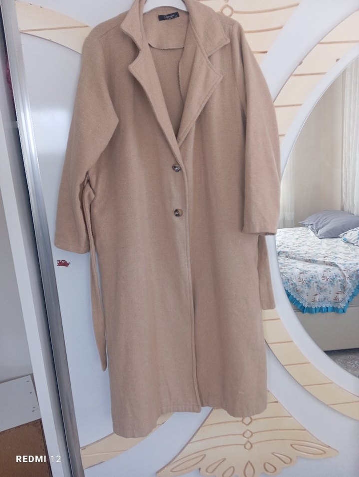 uzun, düğmeli kadın kabanı. uzun kollu, bol kesim tasarımıyla rahat ve sıcak bir dokunuş sunar.
