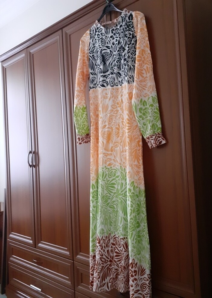 UZUN elbise Çiçekli Viskon kumaş 2 defa giyildi çok güzel duruşu var yeni den farkı yok ölçüler iki kol arası 43 cm. Uzunluk 143 cm.bel 38 cm. Özel dikim sadece overlok yapılmamış alana hayırlı olsun iade kabul etmiyorum