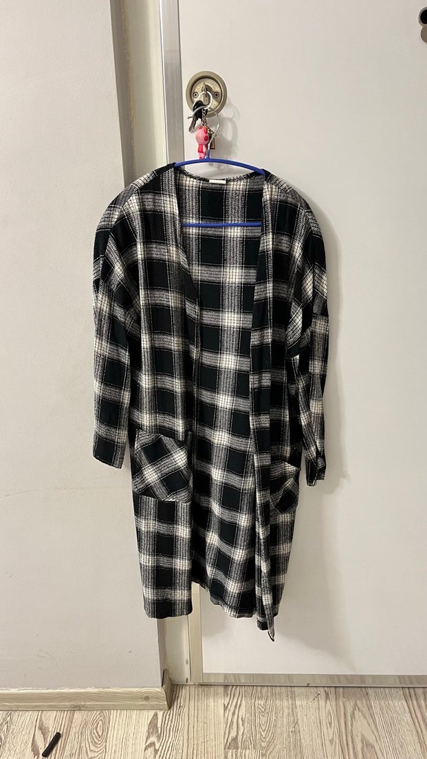 Uzun ve bol kesim kadın kaban, koyu gri ekose desenli, uzun kollu ve kesik yakalıdır. Yumuşak ve sıcak kumaştan yapılmış, düğmeli ve ön ceplidir.