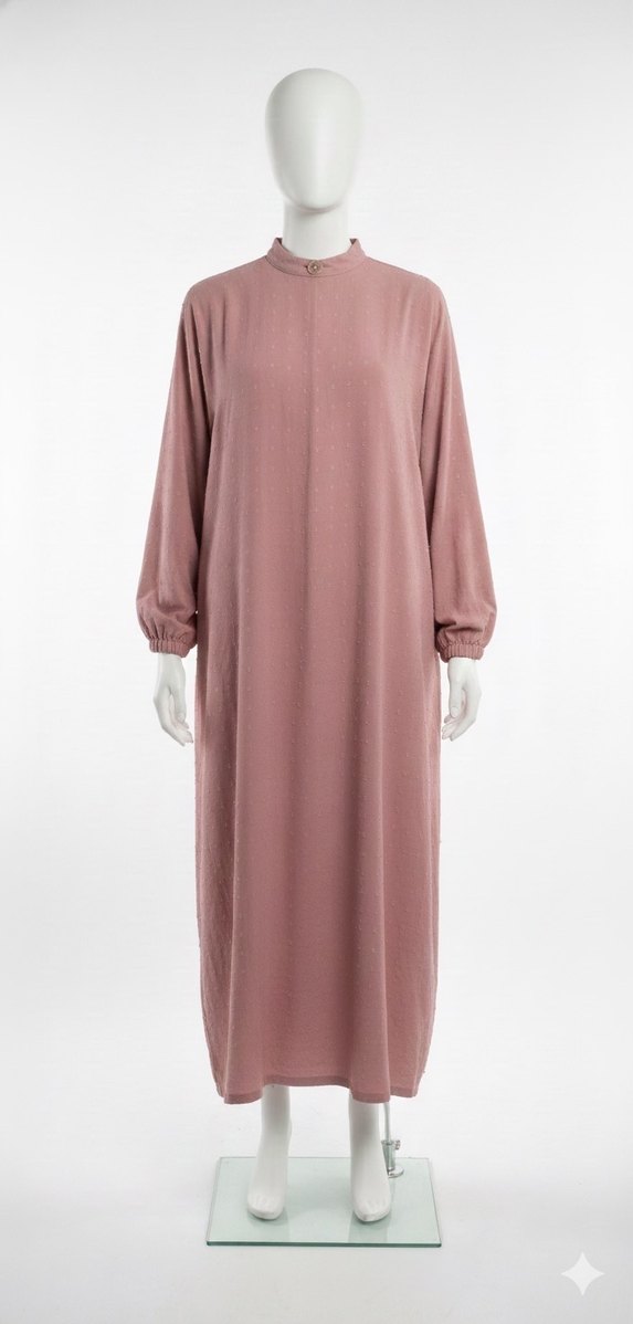 Uzun, salaş kesim kadın elbisesi, uzun kollu ve minimalist tasarıma sahip, pastel pembe renktedir. Desensiz, normcore tarzındadır. İki kol arası tek yön 68, boy 135