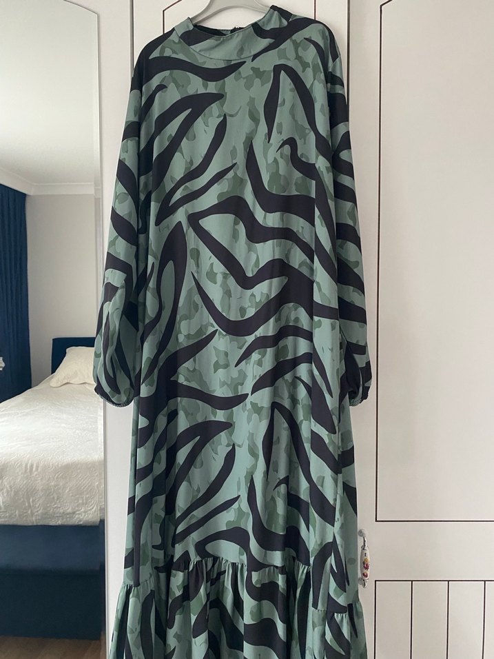 Tesettüre uygun Uzun yeşil elbise, zebra desenli Neredeyse hiç giyilmedi evde çok elbise olduğu için satıyorum 46 48 beden