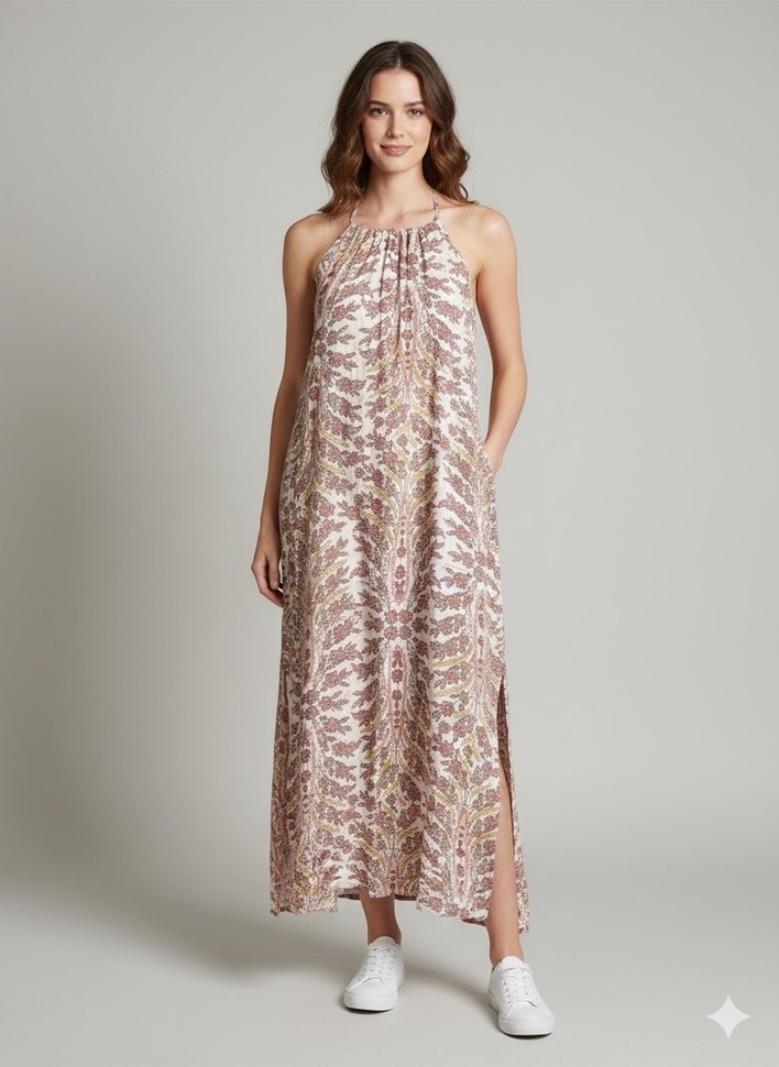 • Model: Boyundan bağlamalı Halter Yaka ve ince askılı elbise. • Kesim: Vücudu saran, maksi (uzun) kesim. • Yırtmaç Detayı: Elbisenin üç kenarında 20 cm uzunluğunda yırtmaç detayı bulunmaktadır. Bu detay, elbiseye hareketlilik ve modern bir hava katar. • Desen: Göz alıcı ve şık desenleri sayesinde tek başına bile iddialı bir görünüm sunar. • Kullanım: Yaz akşamları, tatil, özel davetler veya plaj/havuz üstü için mükemmel bir parçadır. Detaylı Ölçüler • Elbise Boy Uzunluğu: 115 cm (Askı başlangıcından etek ucuna ölçülmüştür.) • İki Koltuk Altı Arası Mesafe (En): 51 cm (Göğüs çevresinin yaklaşık 102 cm olduğunu gösterir, M beden için rahattır.) • Yırtmaç Uzunluğu: 20 cm (Üç Kenarında) ️ Satıcı Notu • Ürün bir kere giyilmiştir • Yaz aylarında rahatlıkla kullanabileceğiniz, şık ve göz alıcı bir parçadır. • Kargo süreci ve sorularınız için mesaj atabilirsiniz