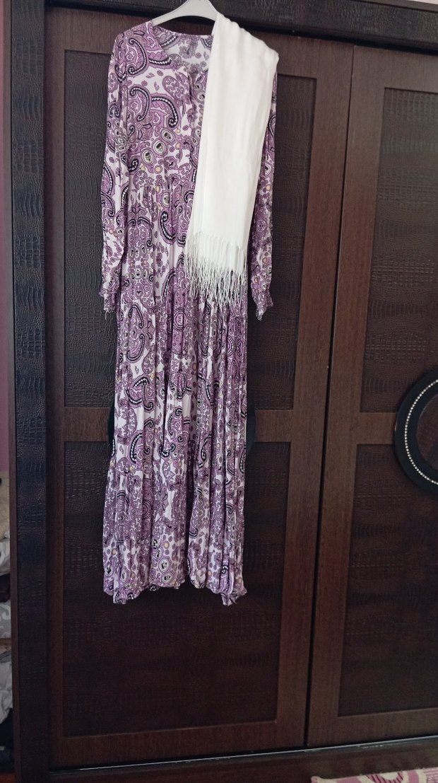 uzun elbise ufak bir dikiş açılması var görsele ekledim şal hediyem ölçüleri görselde mevcut makul fiyat veriyorum