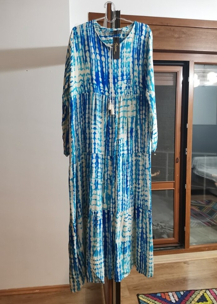 Kendime aldım, çok severek beğenerek aldığım bir elbiseydi, denemeden aldığım için, bedeni olmadı, geri verme gibi bir şansım olmadığından satışta Tril tril yazlık bir kumaşı var, hiç giyilmedi sıfır etiketi üzerinde İki kol altı arası ölçüsü 51cm Boyu 136cm. Etiketinde S beden yazıyor ancak, ölçülerini baz alarak Alım yapılmalı. Ölçülerine bakıldığında 42_44 bedene uyuyor