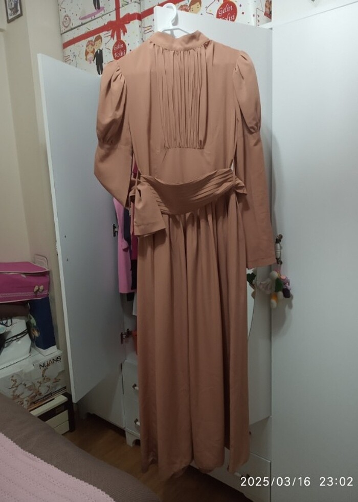 Hakim yaka, uzun, beli kemerli, soğan kabuğu rengi iki üç kez giyilmiş elbise 36 beden yazmasına rağmen 38-40 giyebilir