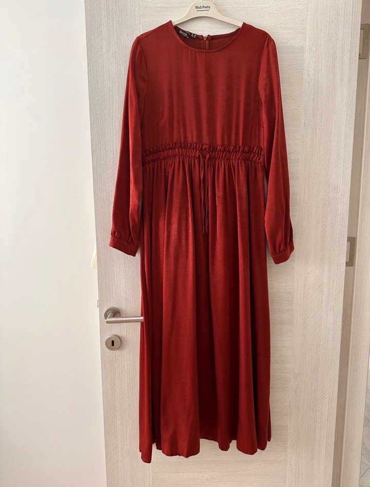 Bordo uzun elbise, drapeli ve bol kesimlidir. Uzun kollu ve yuvarlak yakalı, parlak dokusuyla sade ve şık bir görünüm sunar.