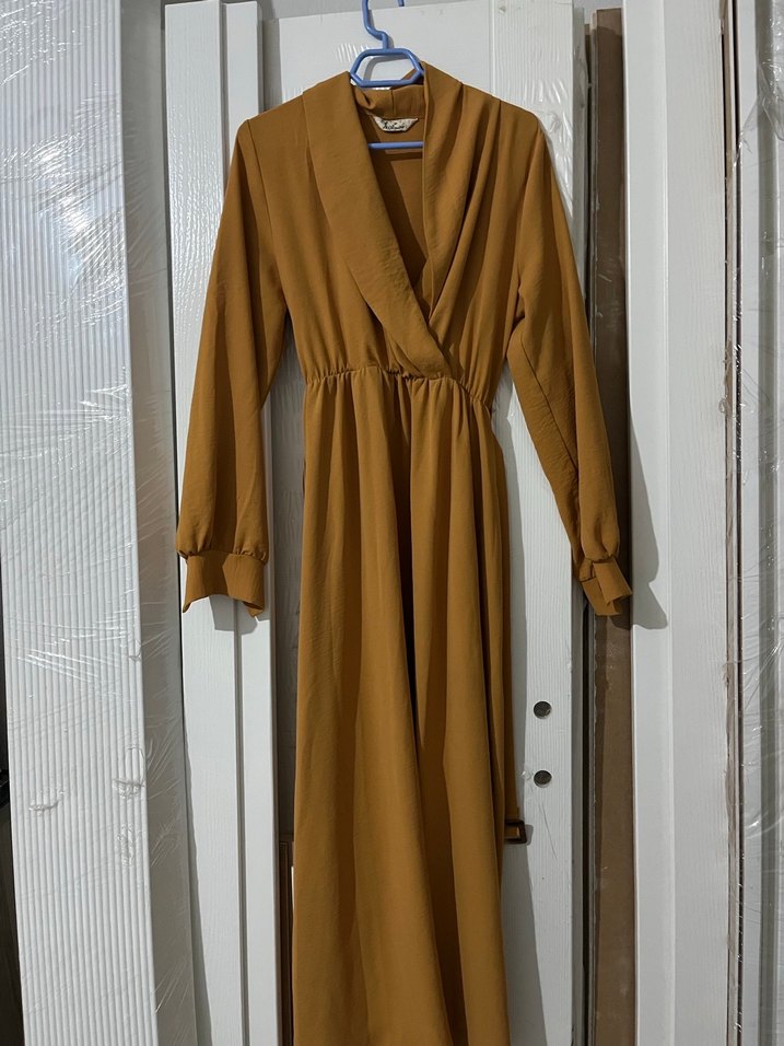 Hardal sarisi v yaka elbise kemeri mevcuttur