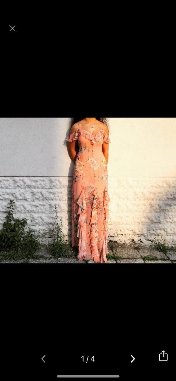 Drapeli detaylara sahip, straplez ve vücuda oturan uzun elbise. Pudra pembe çiçekli desenli, ipeksi dokulu kumaştan. Bohem ve retro tarzlar için uygun, düğünlere ideal.