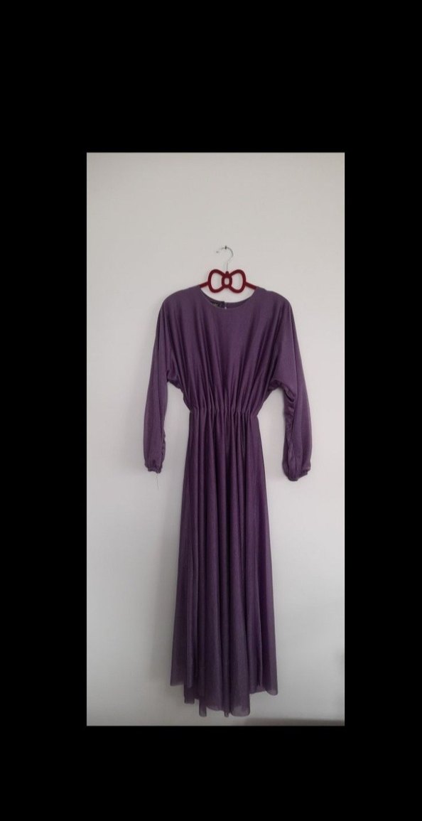 hiç giyilmedi etiketi yok, simli lila mor esnek kumaş tiril tiril çok hafif, standart beden 38-40-42 beden uyumlu 44 bedenede olur ama biraz fazla yapışır üst kısmı beli büzgülü lastikli kolları yarasa kol bilekleri lastikli yuvarlak yaka kloş elbise Tam boy astarlı kolları da astarlı iç göstermez kuşağı mevcut boy 131cm tüm detayları fotoğraflarda mevcuttur.. hiçbir kusuru yoktur.