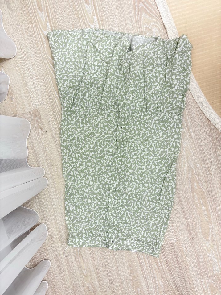 , bol kesim ve pile detaylı etek. Bohem tarzda, gri desenli haki renkte, günlük kullanım için uygun.