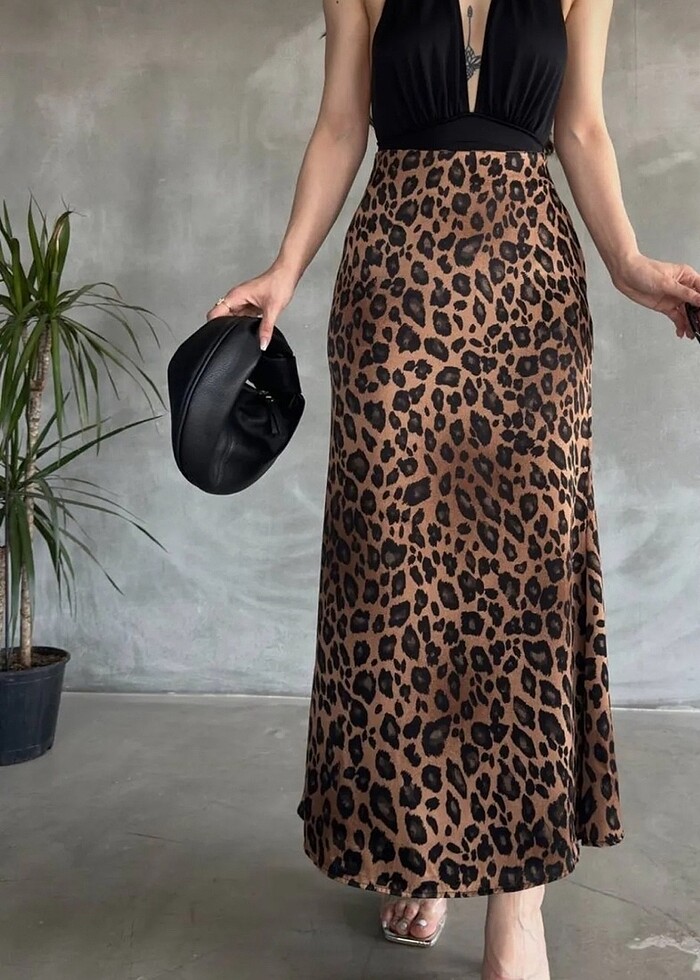 leopar desenli uzun etek saten kumaşlı hiçbir defosu yoktur likraşıdır S-M beden uyunludur bir kez giyildi