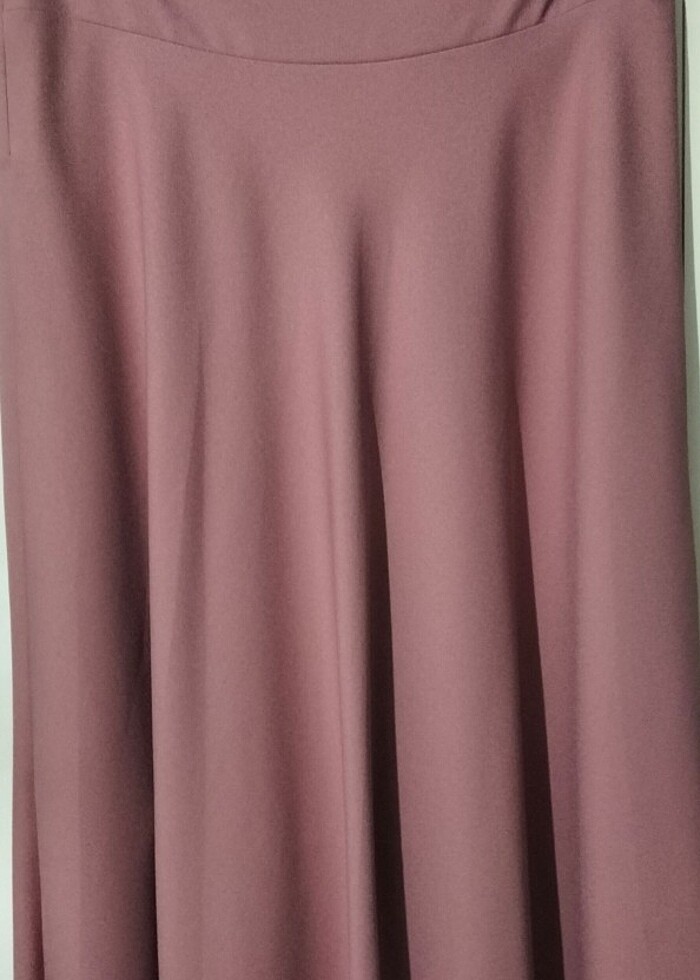 Bir kez bir kaç saat giyildi.44,46 beden uyumlu çok rahat ütü istemez kumaş beli şık detaylı koyu pudra pembesi uzun etek.Boy 102 bel 88