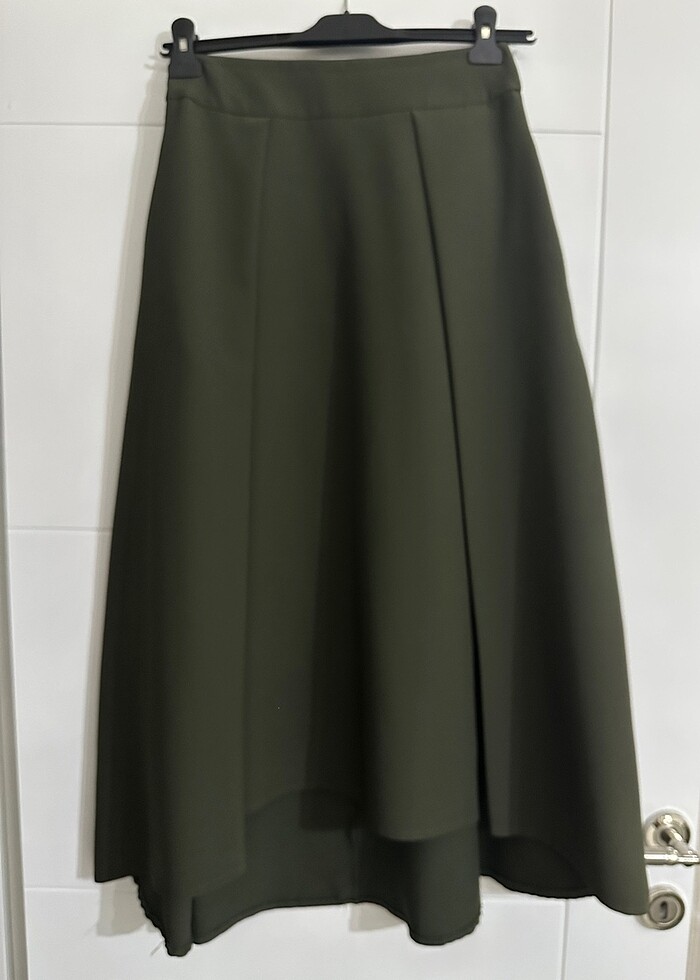 Önü kısa arkası uzun haki renkli çok güzel bir etek. Çok severek giydim bedeni olsa asla satmazdım