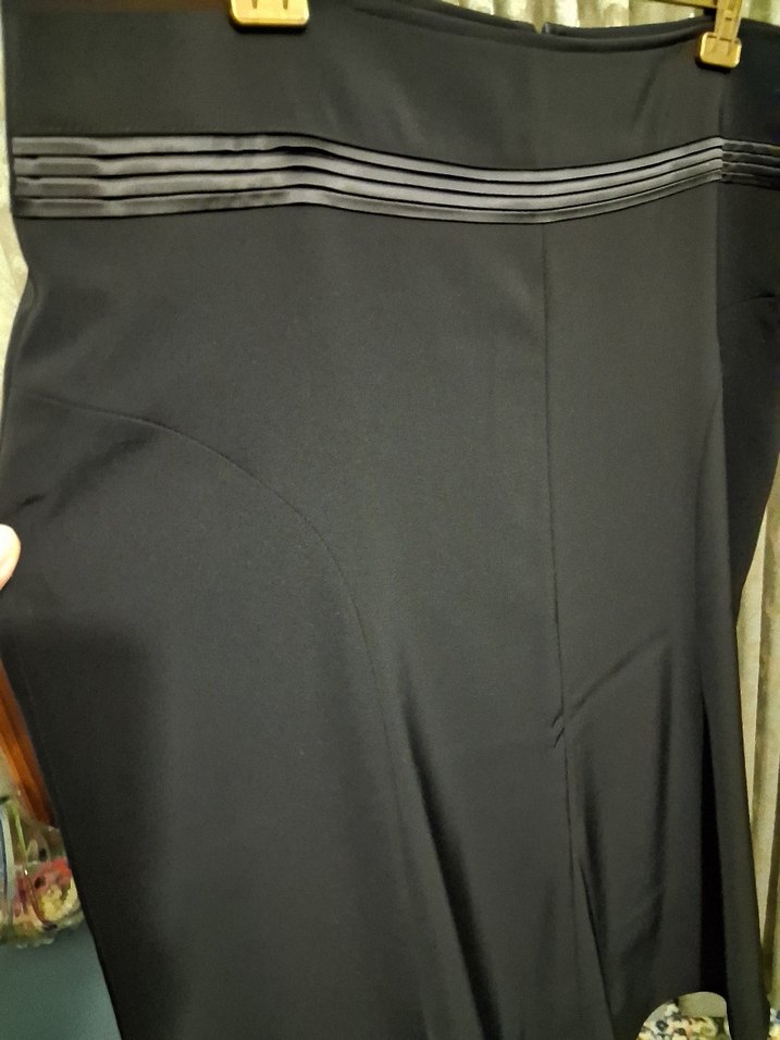 Uzun siyah etek, viskon, polyester, lycra karışımı, ipeksi biraz parlak kumaş, çok iyi durumda, az kullanıldı. Fesba marka, 54.B.