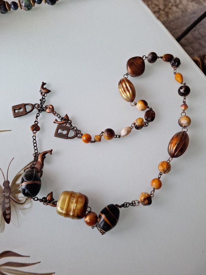 Uzun, koyu kahverengi boncuklardan oluşan bu kolye, etnik desenlerle bohem ve retro bir tarz sunar, günlük kullanım için uygundur.