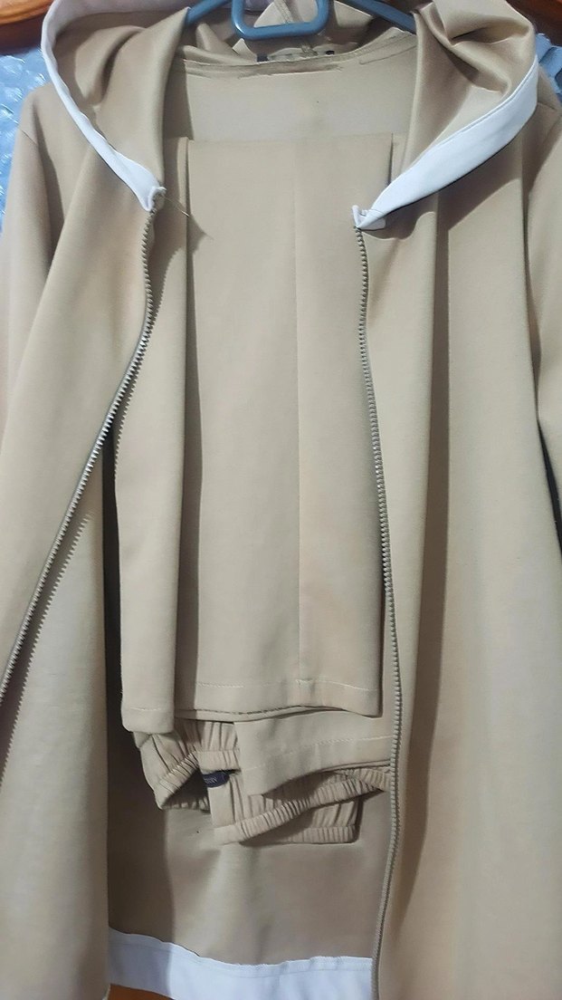 Bej renkli, uzun kesim ve fermuarlı ön kısmı olan takım tunik veya günlük eşofman Strappy kollu ve notched lapel yakalı, minimalist sokak stili tasarım sunar. Günlük kullanıma uygun. çok az tiftiklenmis durumda