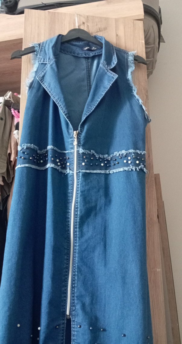 Uzun, kolsuz denim ceketin önünde fermuar ve kesik yaka bulunur. Bel hizasında nakışlı ve parlak detaylı şerit vardır. Rahat kesim, bohem tarzda günlük kullanıma uygundur.