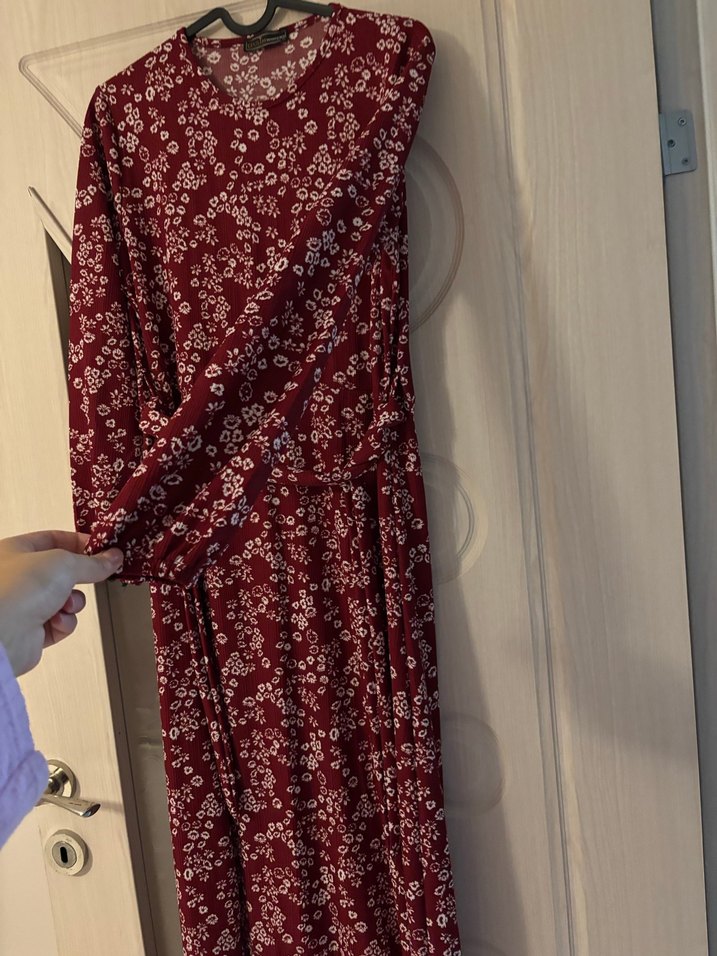 Uzun fırfır detaylı minik çiçek desenli elbise