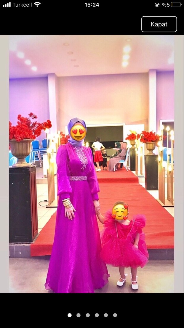 Uzun, fuşya renkte, etnik desenli ve drapeli detaylara sahip tesettür abiye. Yüksek yakalı, uzun kollu ve vücuda oturan kesimiyle şık ve gösterişli.
