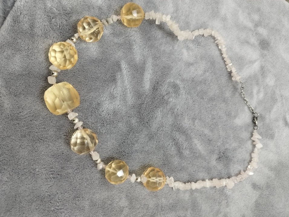 Uzun boylu, parlak gold boncuklar ve beyaz işleme detaylarıyla bohem tarzda minimalist düğün kolyesi.