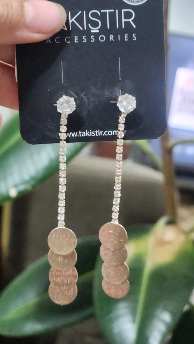 Uzun, gold renkli ve pul detaylı kadın küpeleri. Çağdaş tarzda, düğünler için uygun, hafif parlak ve desensiz tasarım. ✨