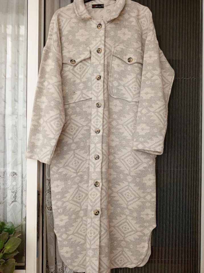 Ürün çok az kullanıldı dolapta beklemekten son fotoğrafta ekledim leke olmuş yıkanınce geçer muhtemelen onun dışında bi deformesi yoktur ürün boyu:109cm iki kol arası:55 cm. Kışlık üründür sıcacık tutuyor ister kaban ister tunik olarak kullanılabilir.