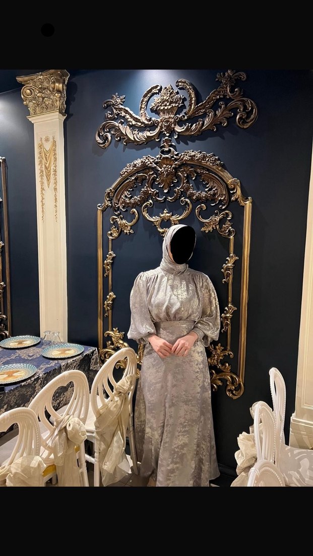 Uzun, bol kesim olan bu elbise yüksek yakalı ve uzun kolludur. Dökümlü tasarımı ve desensiz gri kumaşı ile mütevazı ve avangart stillere uygundur, düğünler için idealdir. Sadece 2 kere giydim hiçbir sorunu yok şalıyla beraber göndereceğim .