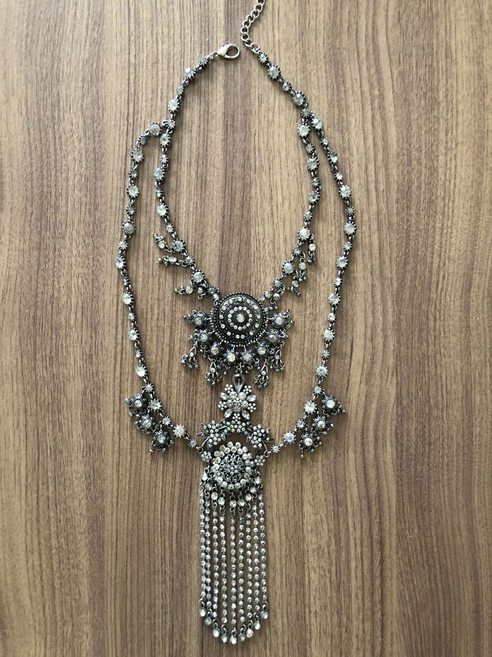Uzun gri boncuklu kolye, nakış detaylarıyla bohem tarzda. Düğün için uygun, detaylı ve sarkıt aksesuarlarla süslenmiş. #zara