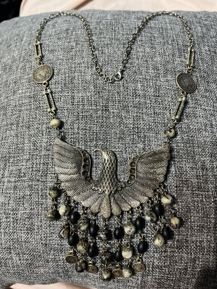 Uzun gri boncuklu ve desenli kartal figürlü, bohem tarzda kadın kolye, günlük kullanıma uygun.