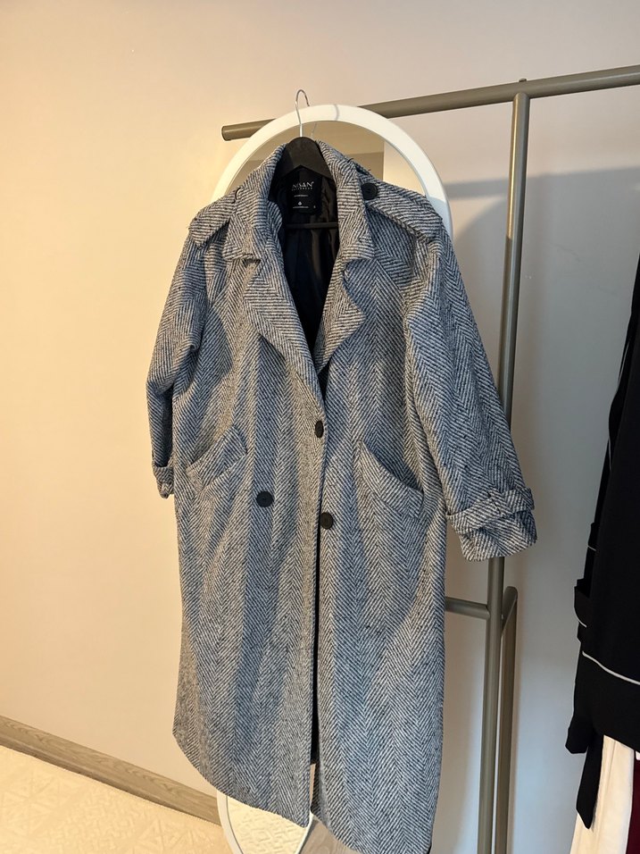 Uzun gri desenli kaban, çift düğmeli kapanış ve büyük ön cepler içerir. Klasik yaka ve sıcak astarı mevcuttur.